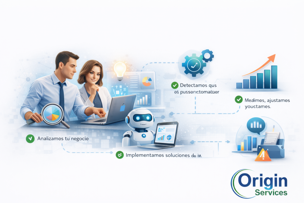 En Origin Services implementamos inteligencia artificial para empresas que quieren mejorar su eficiencia, su visibilidad online y sus ventas mediante: